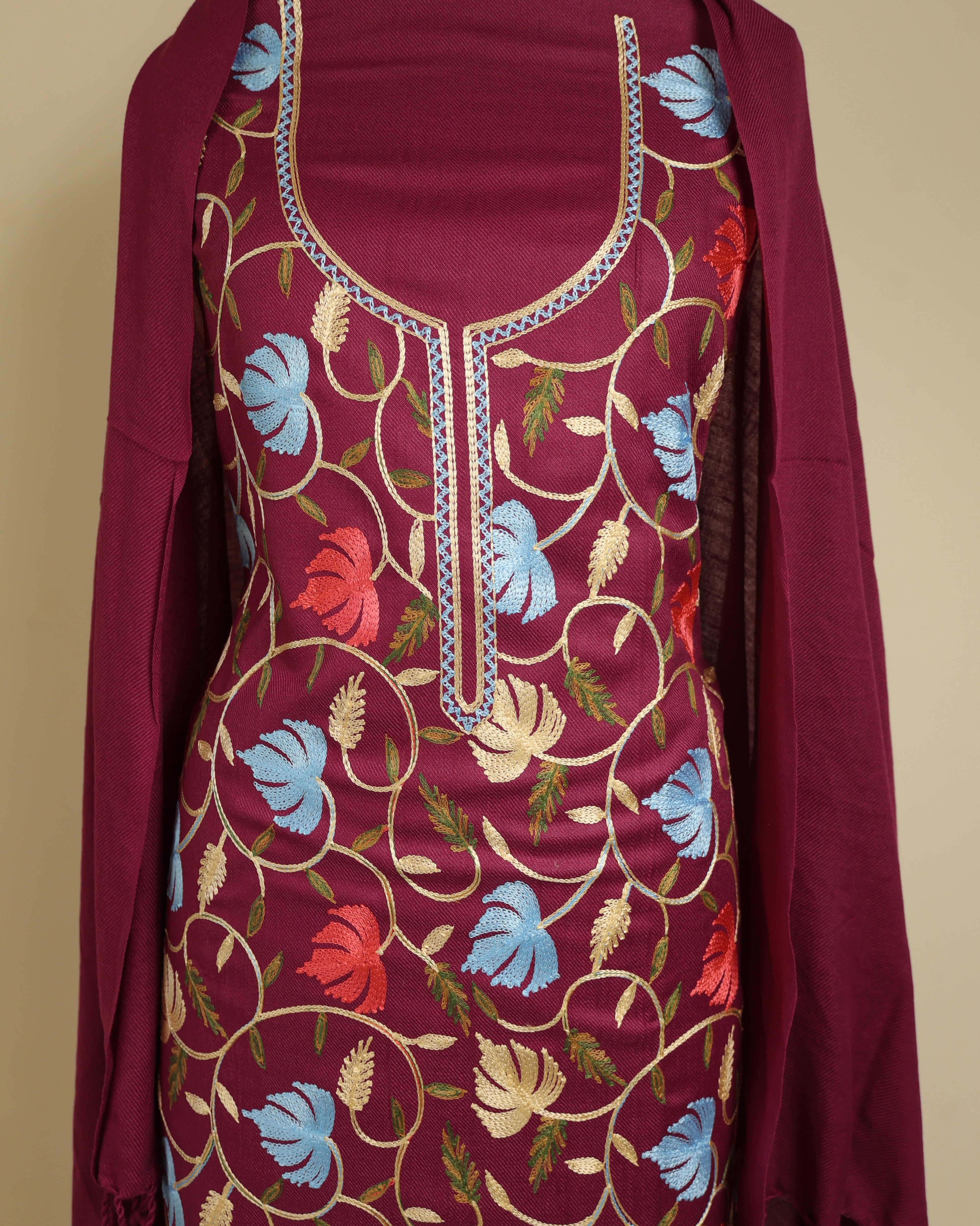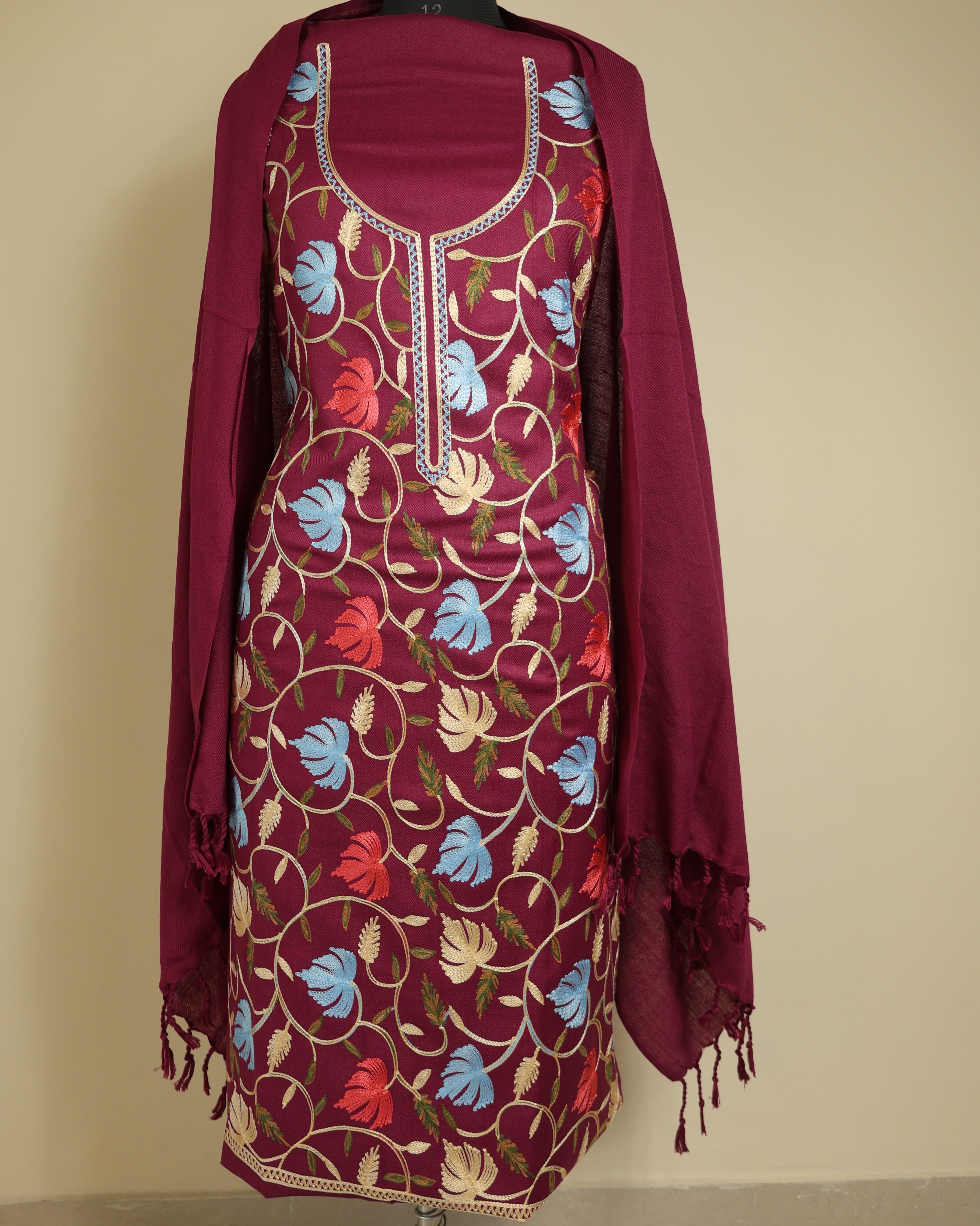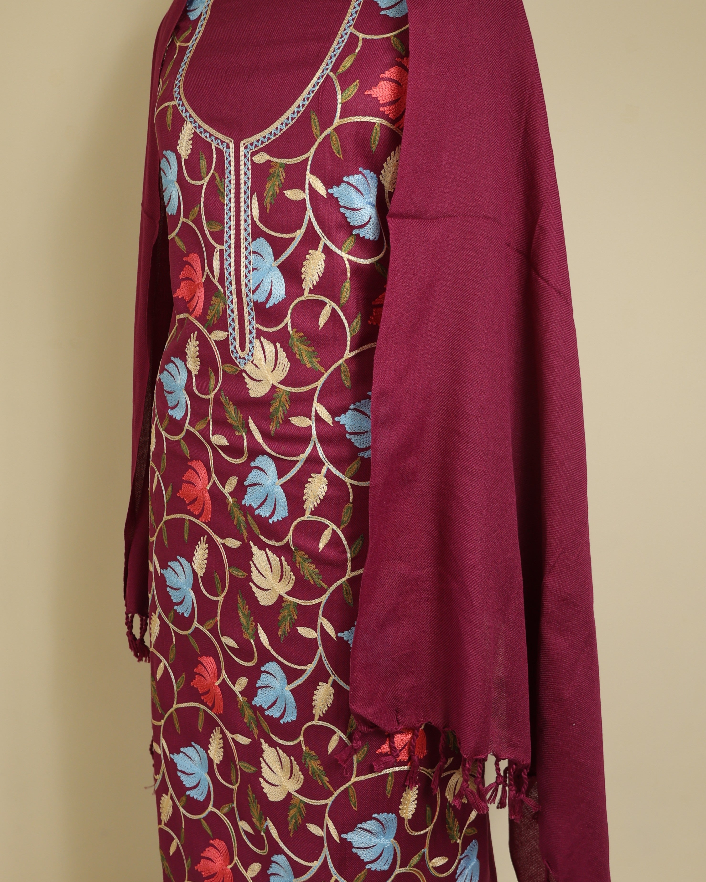 Kurta Fabric:  Soft woolen blend with Aari embroidery in front panel and neck