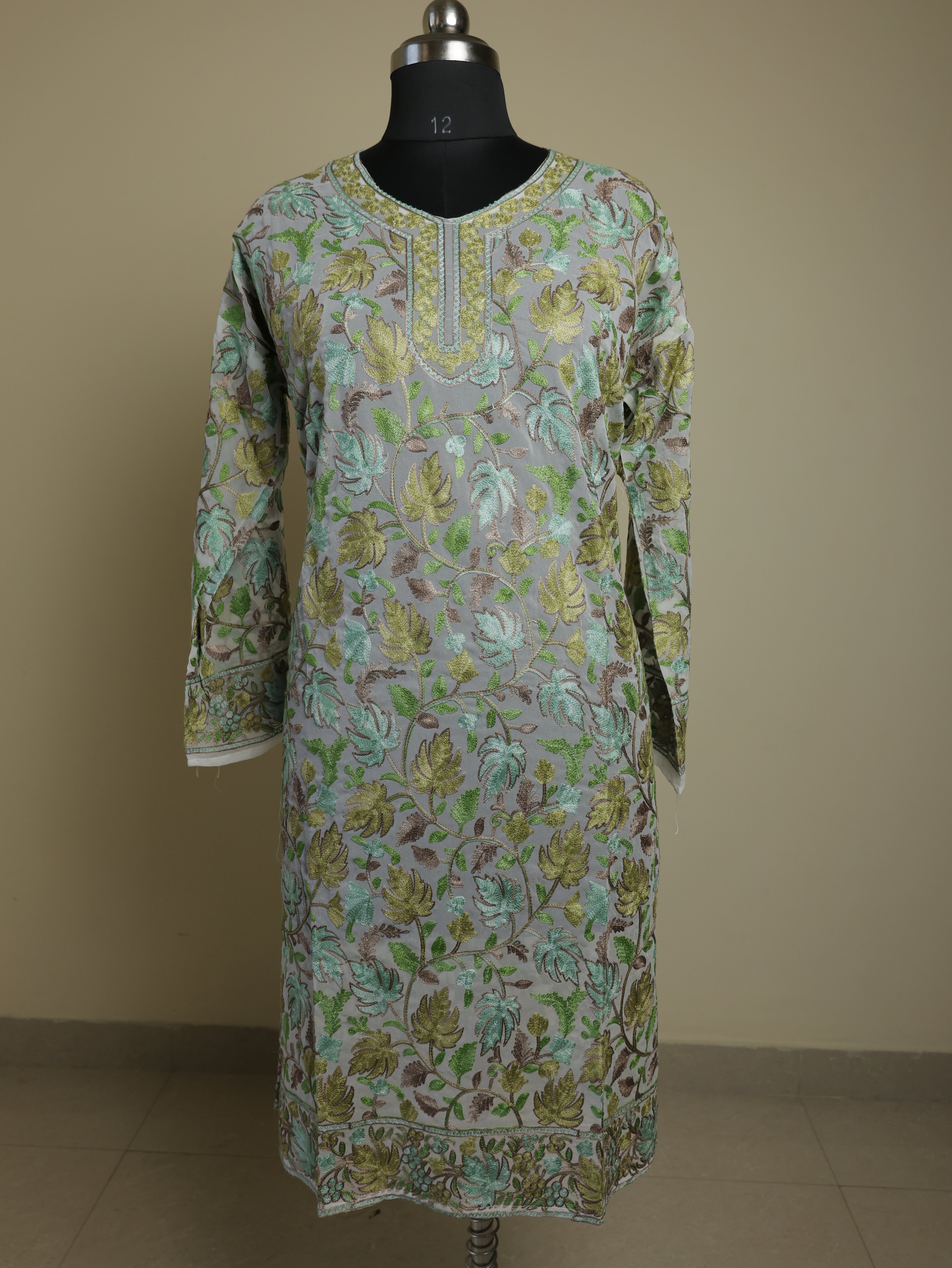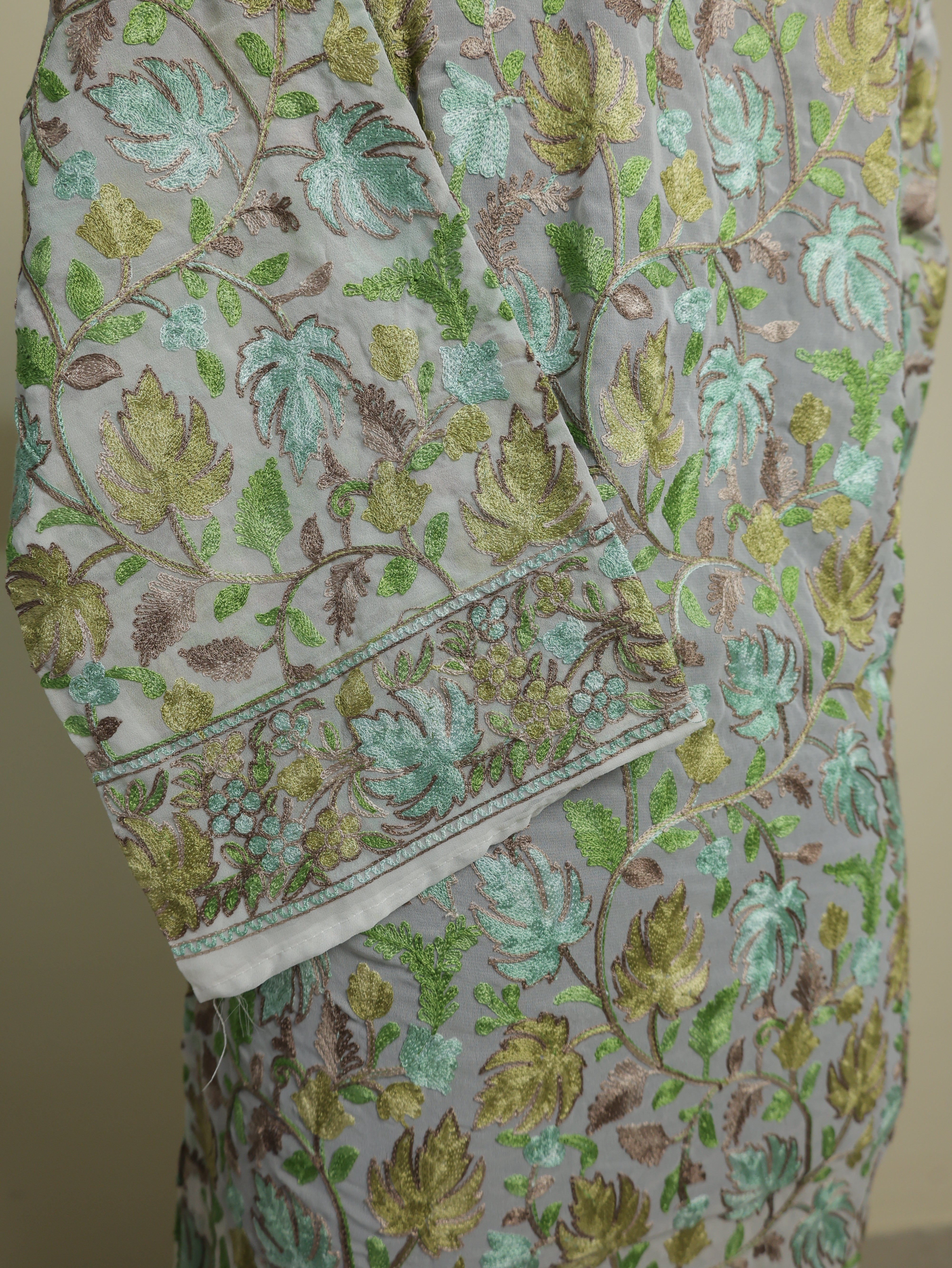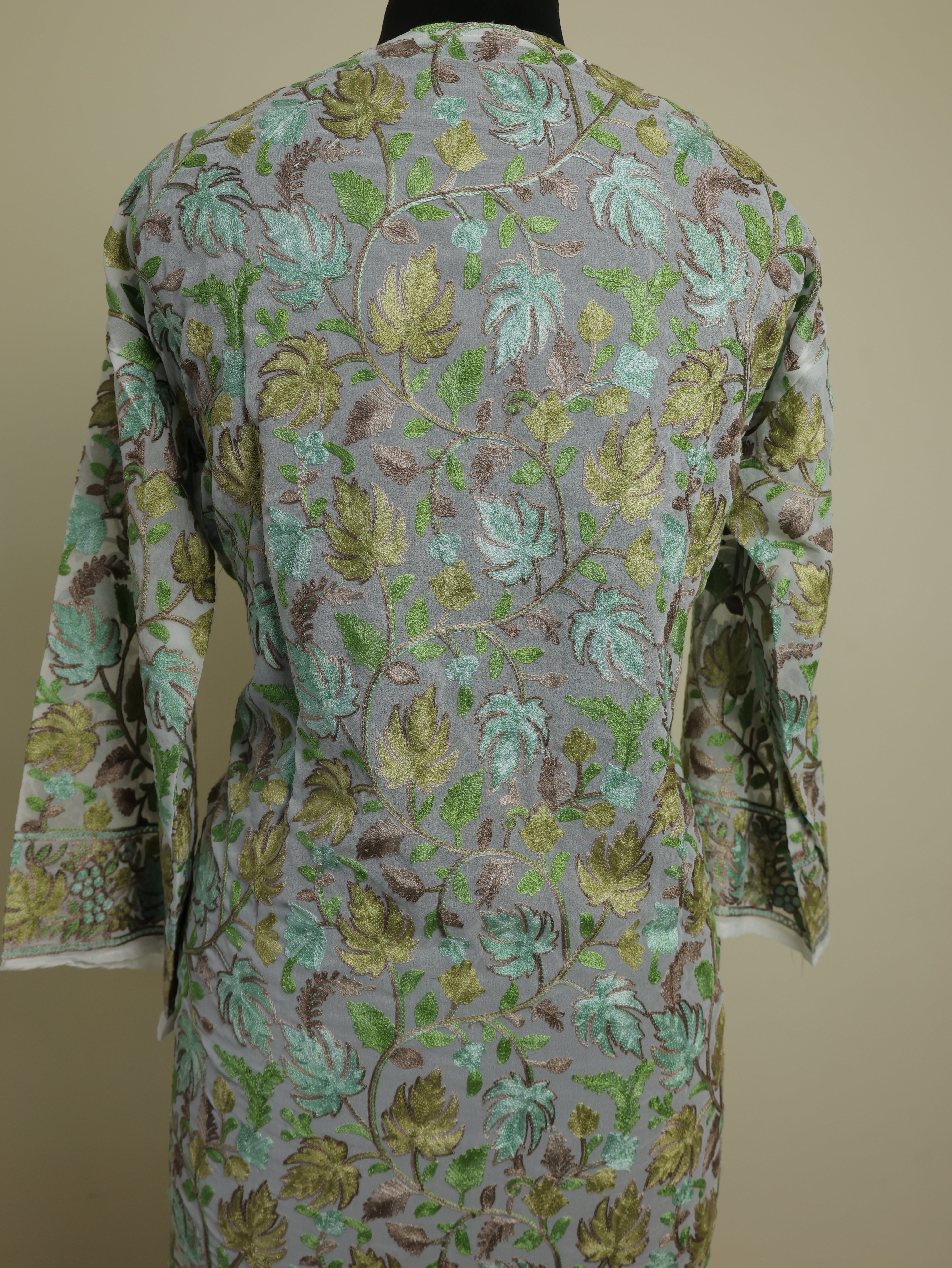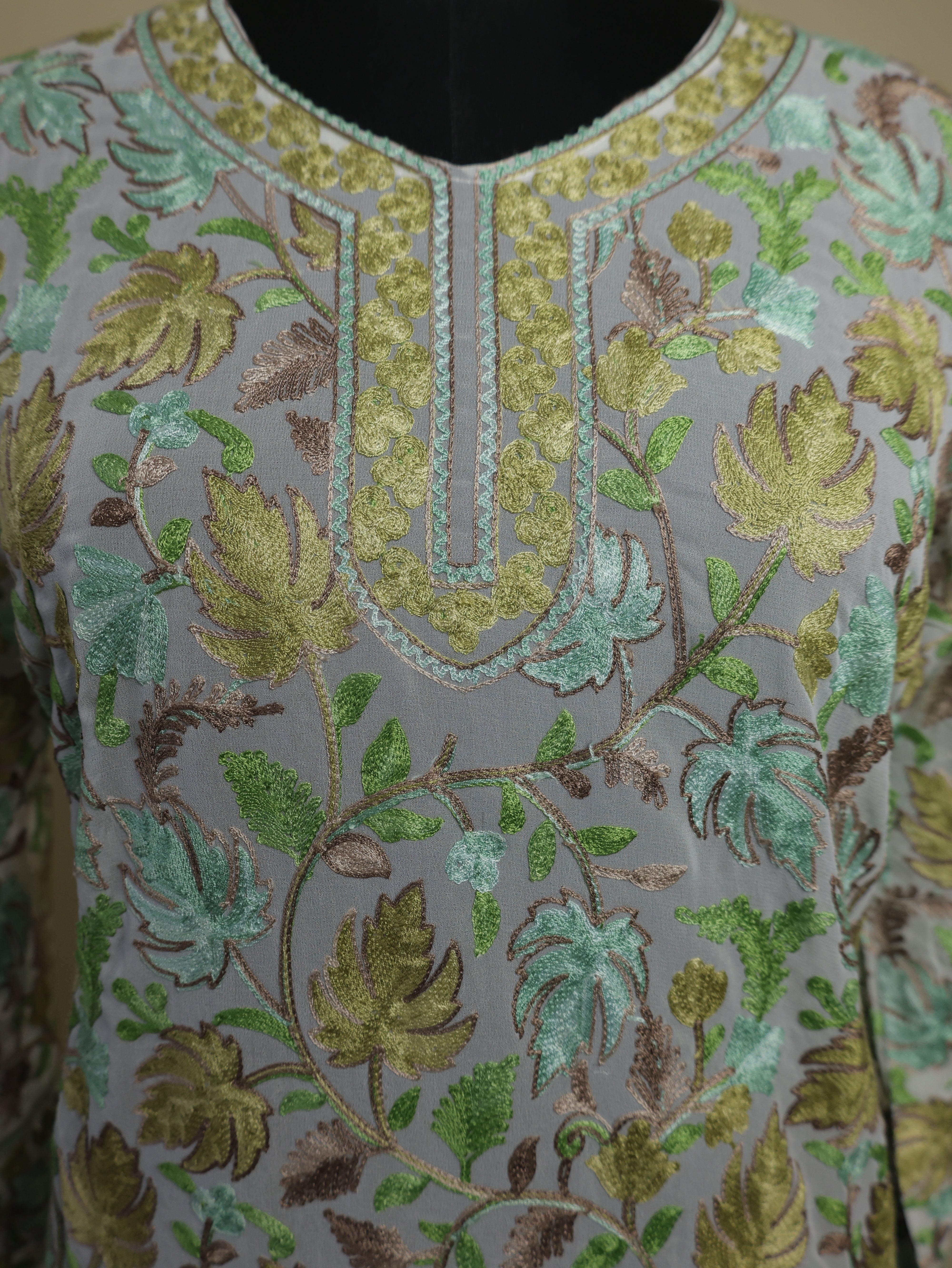 LAILA – Kashmiri Inspired Aari Work Semi-Stitched Georgette Kurta (Silver)