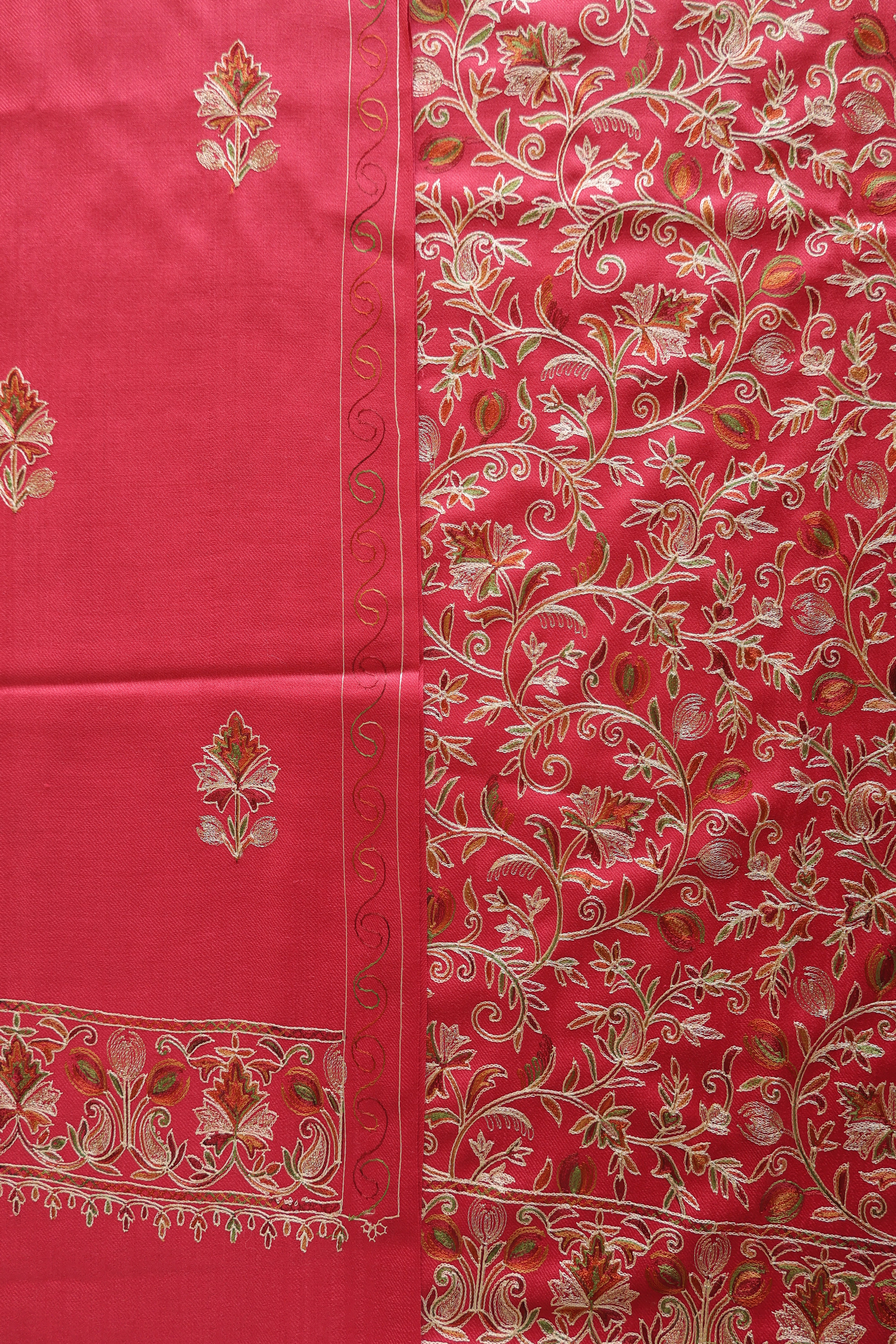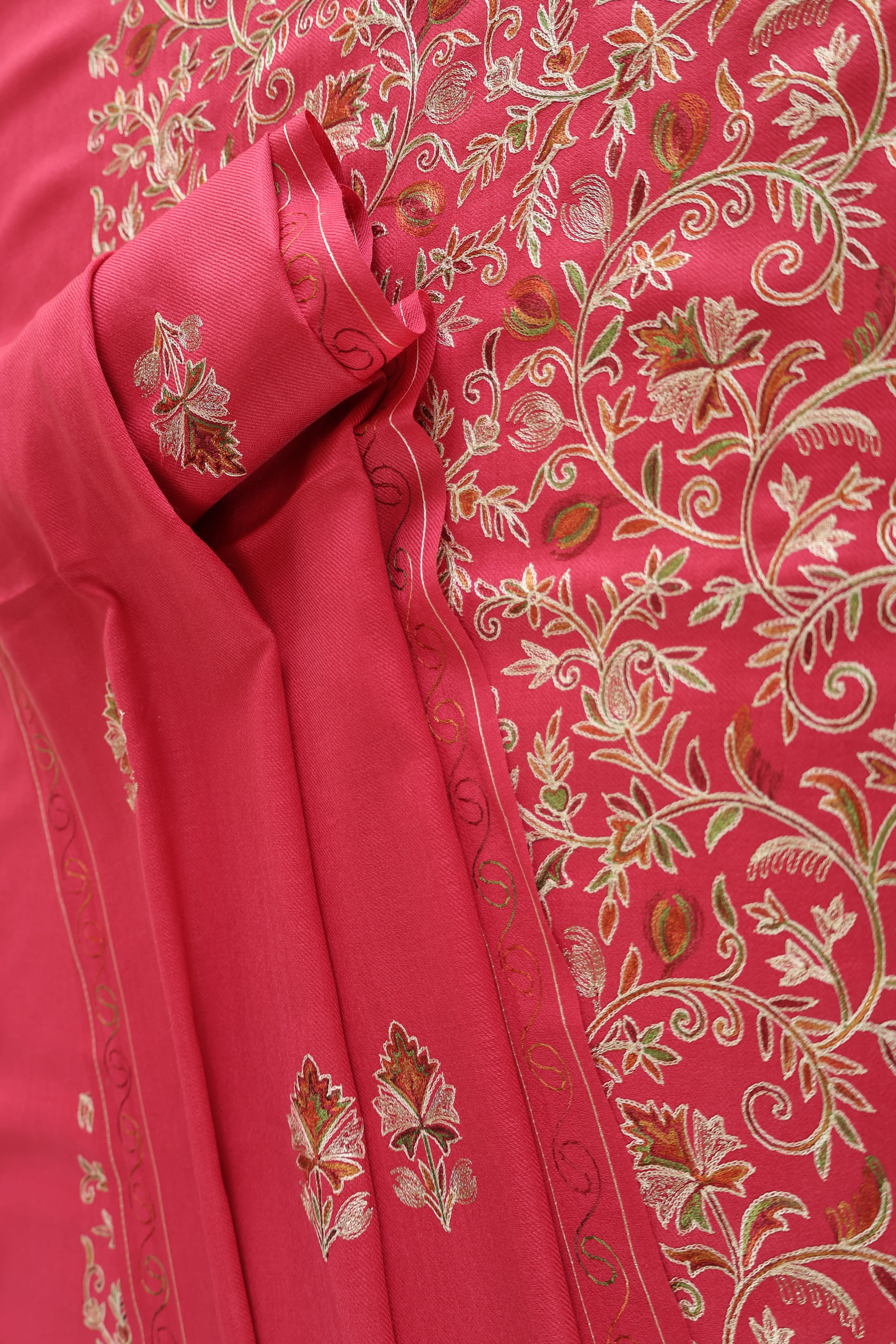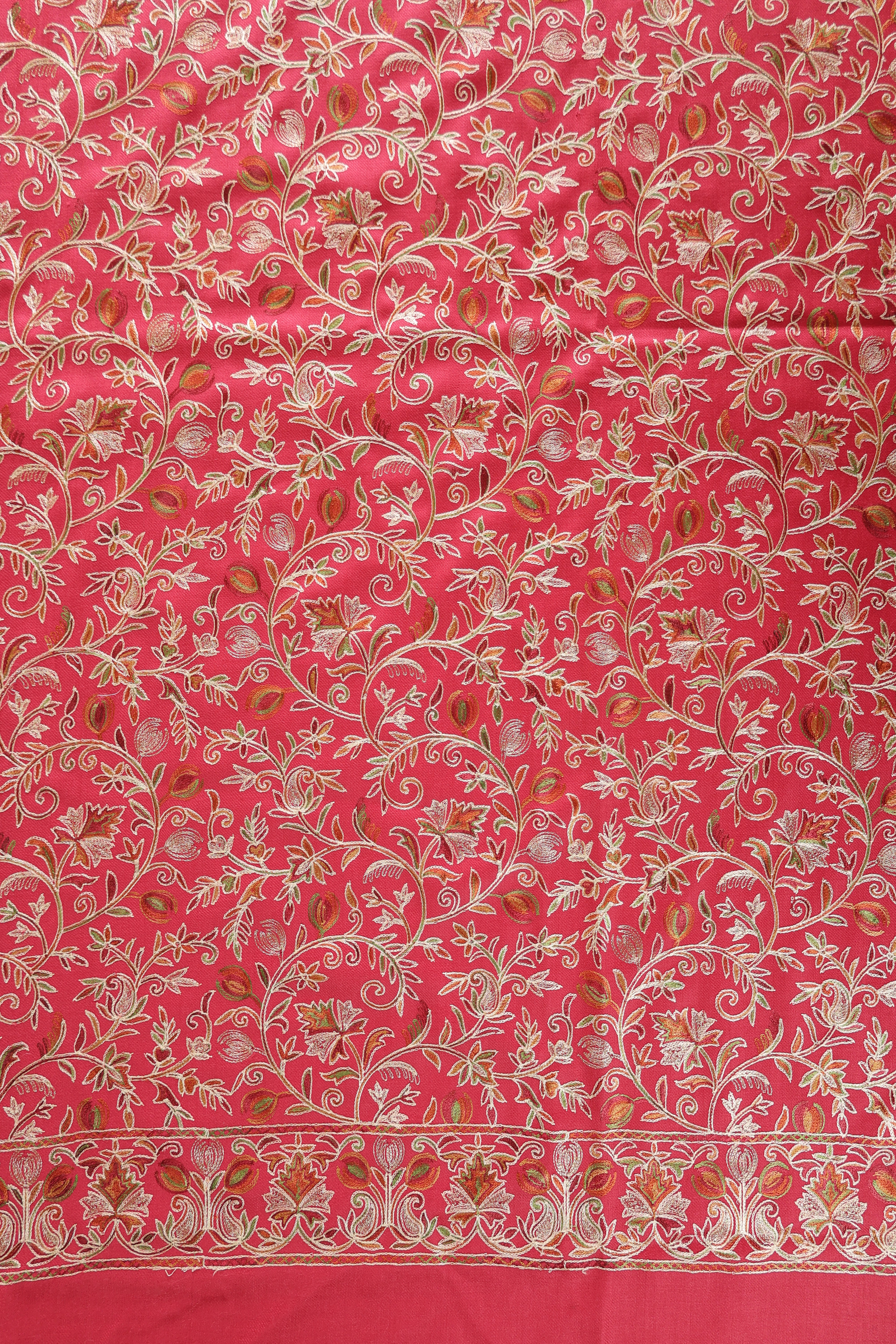 • Kurta Fabric: Semi Pashmina with multicolored floral Aari embroidery + Zari work on front panel