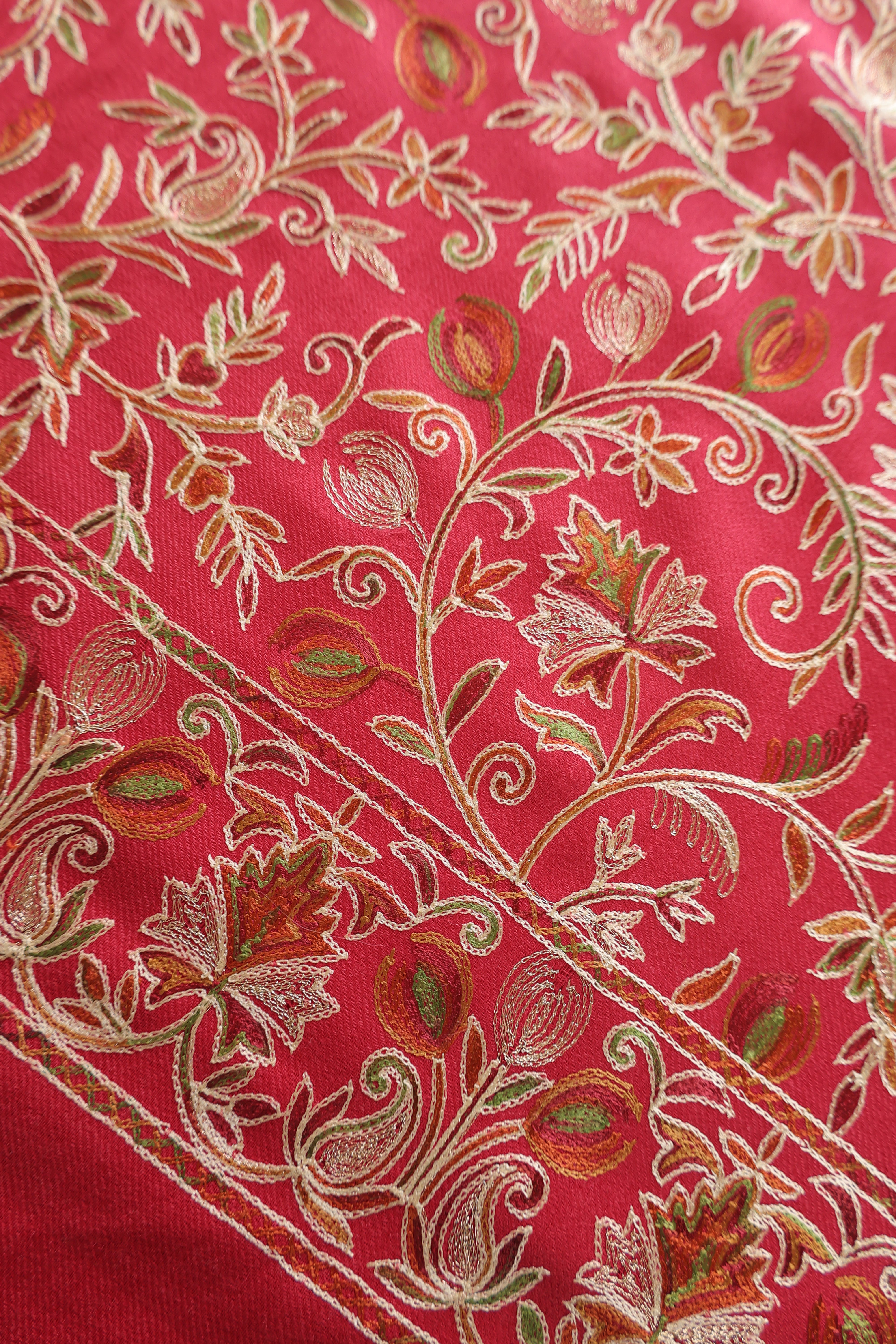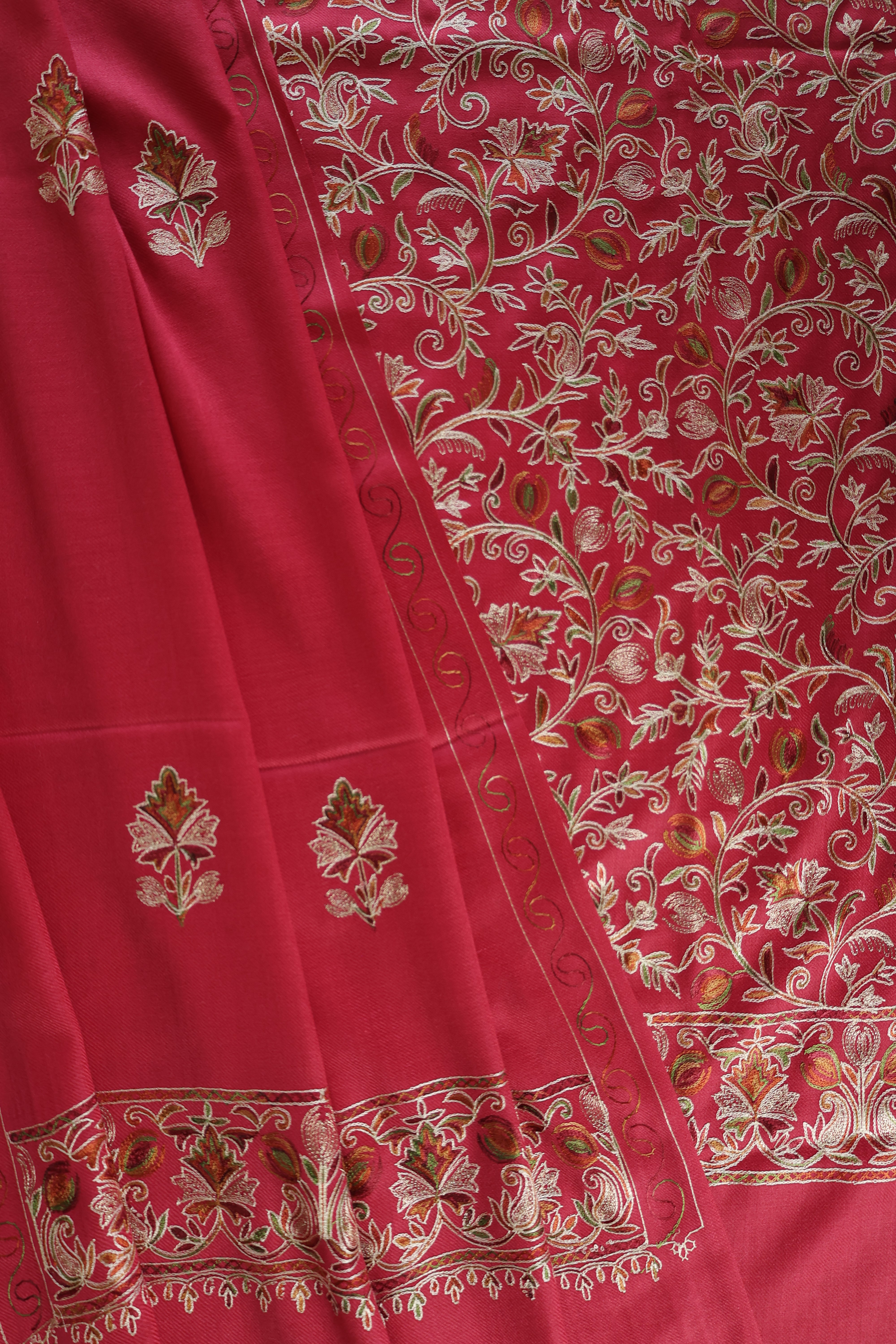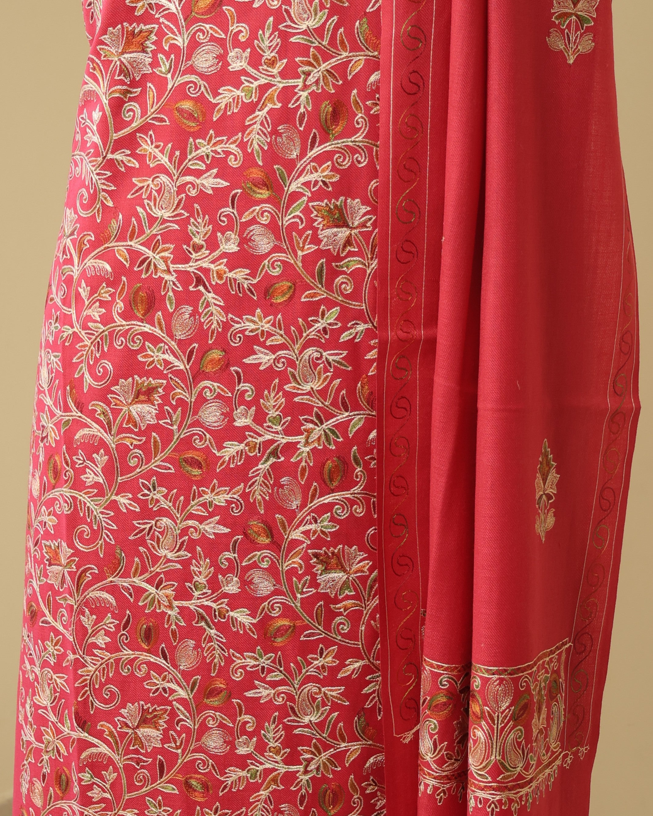 • Kurta Fabric: Semi Pashmina with multicolored floral Aari embroidery + Zari work on front panel