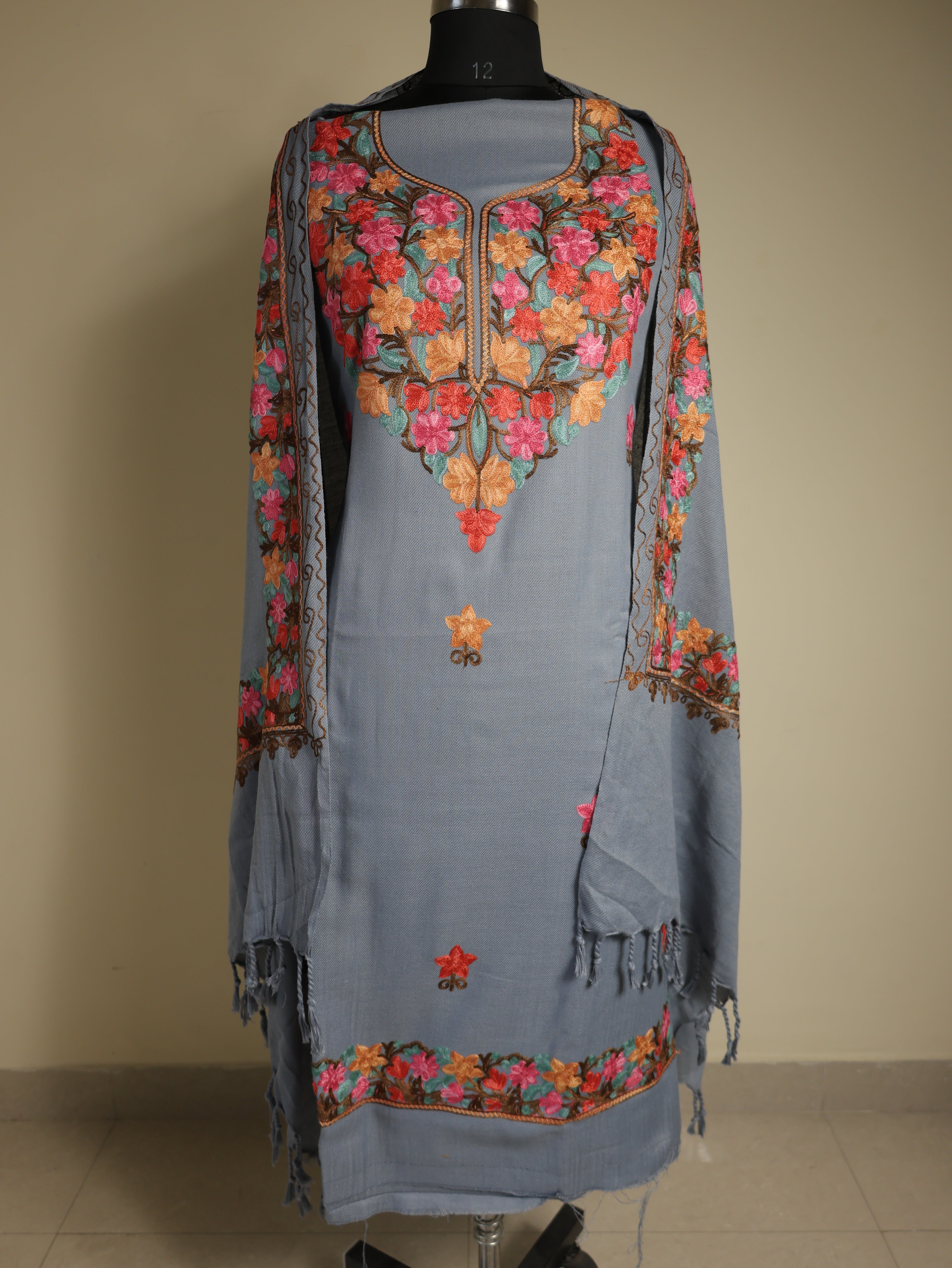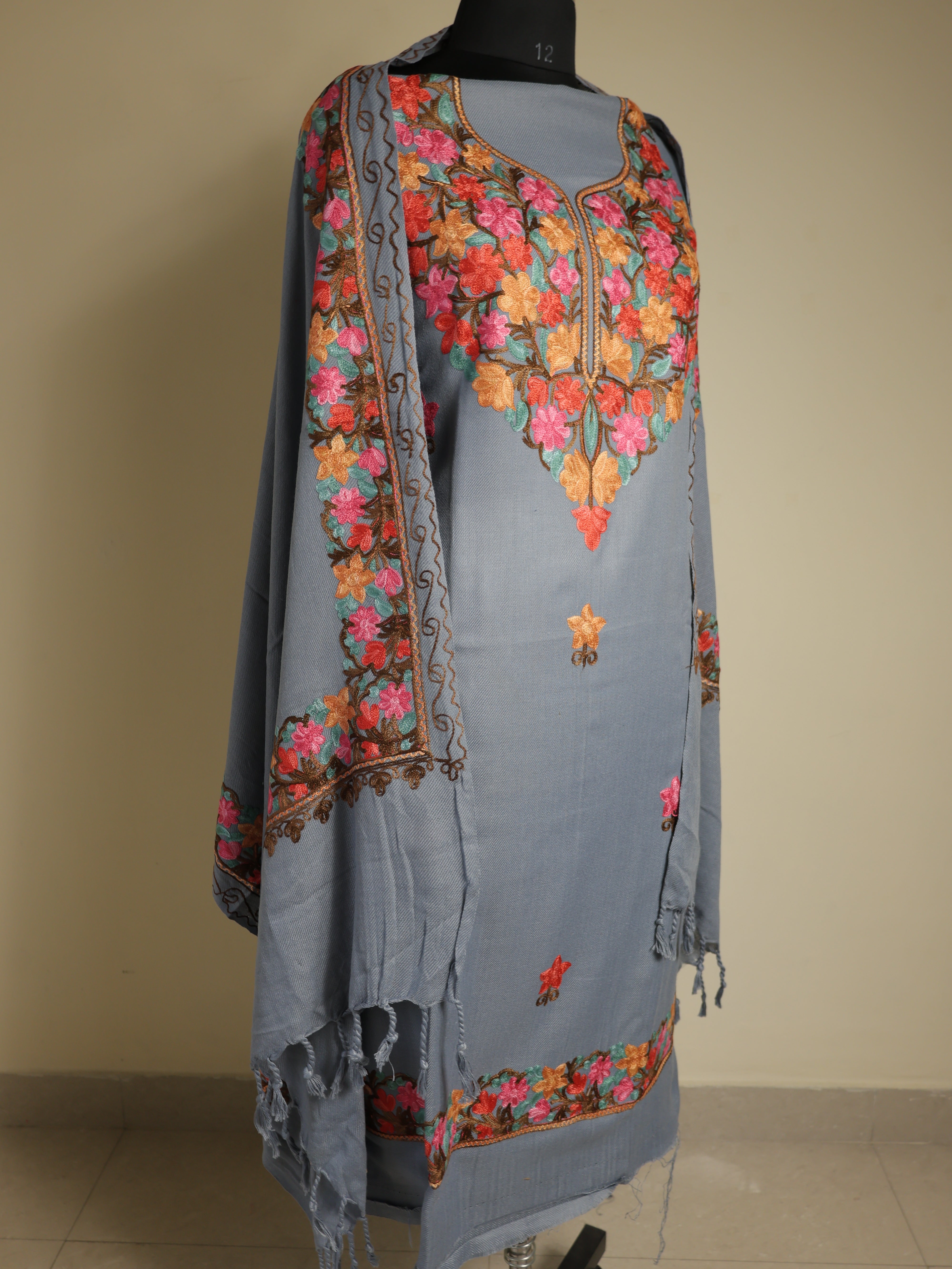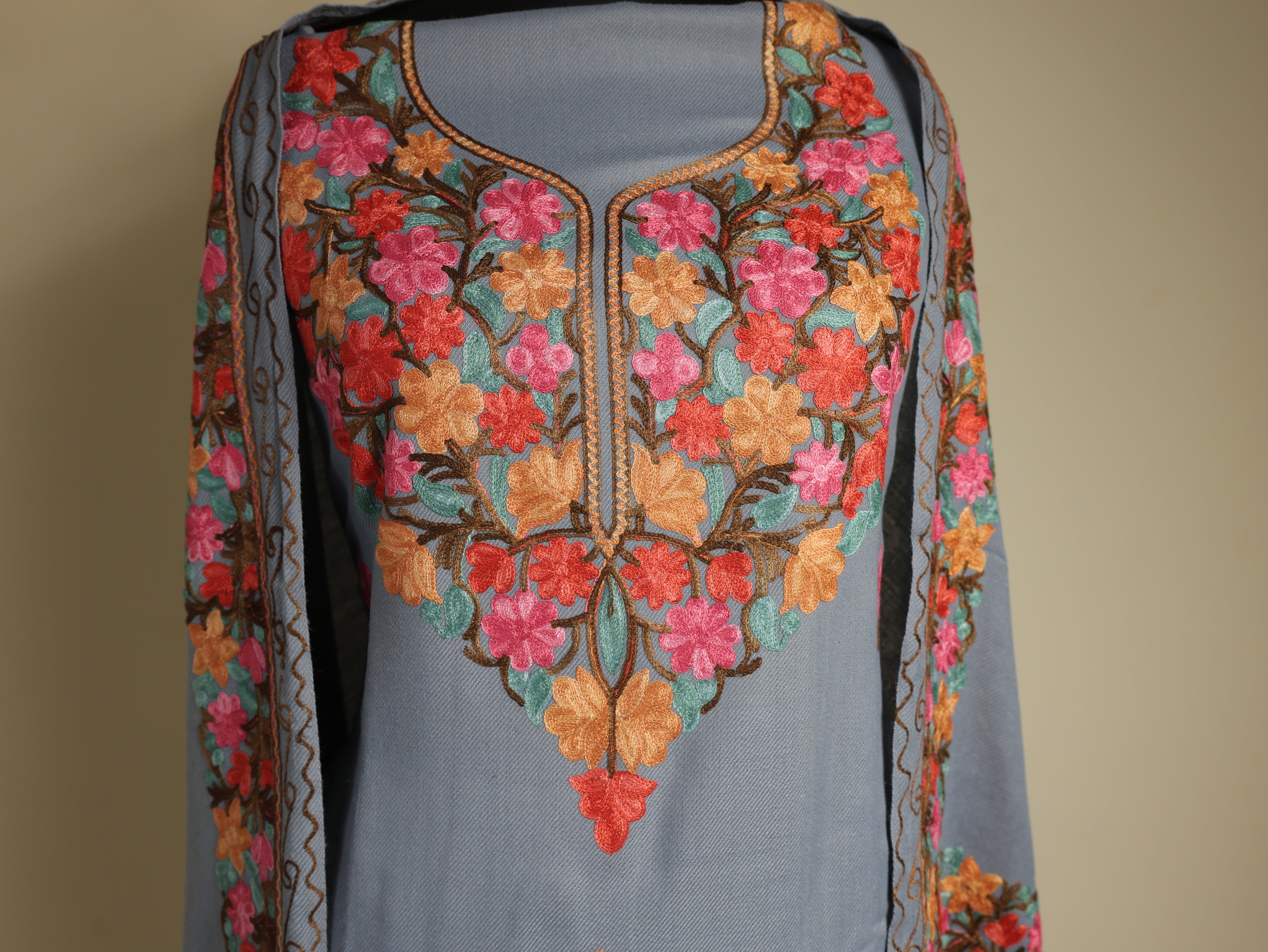• Kurta Fabric: Soft woollen blend with Kashmiri-style Aari embroidery on neckline and front